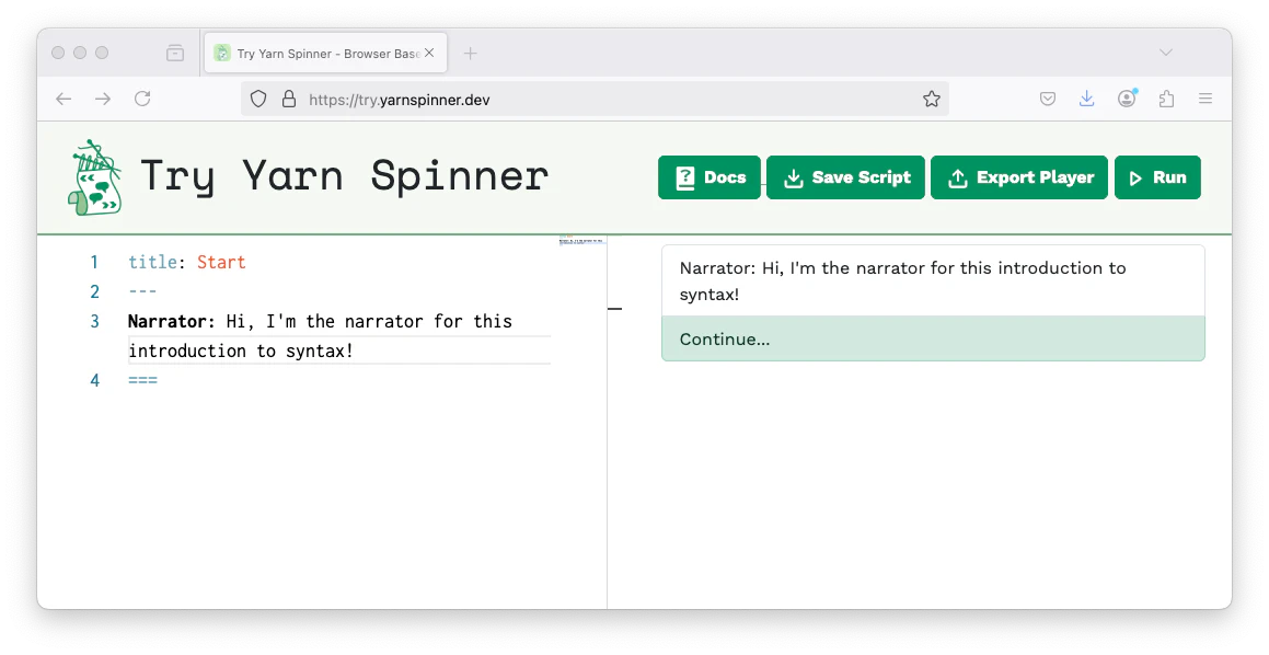 When you first start learning, the best tool to work with is Try Yarn Spinner, so fire up your web browser—no installation necessary: