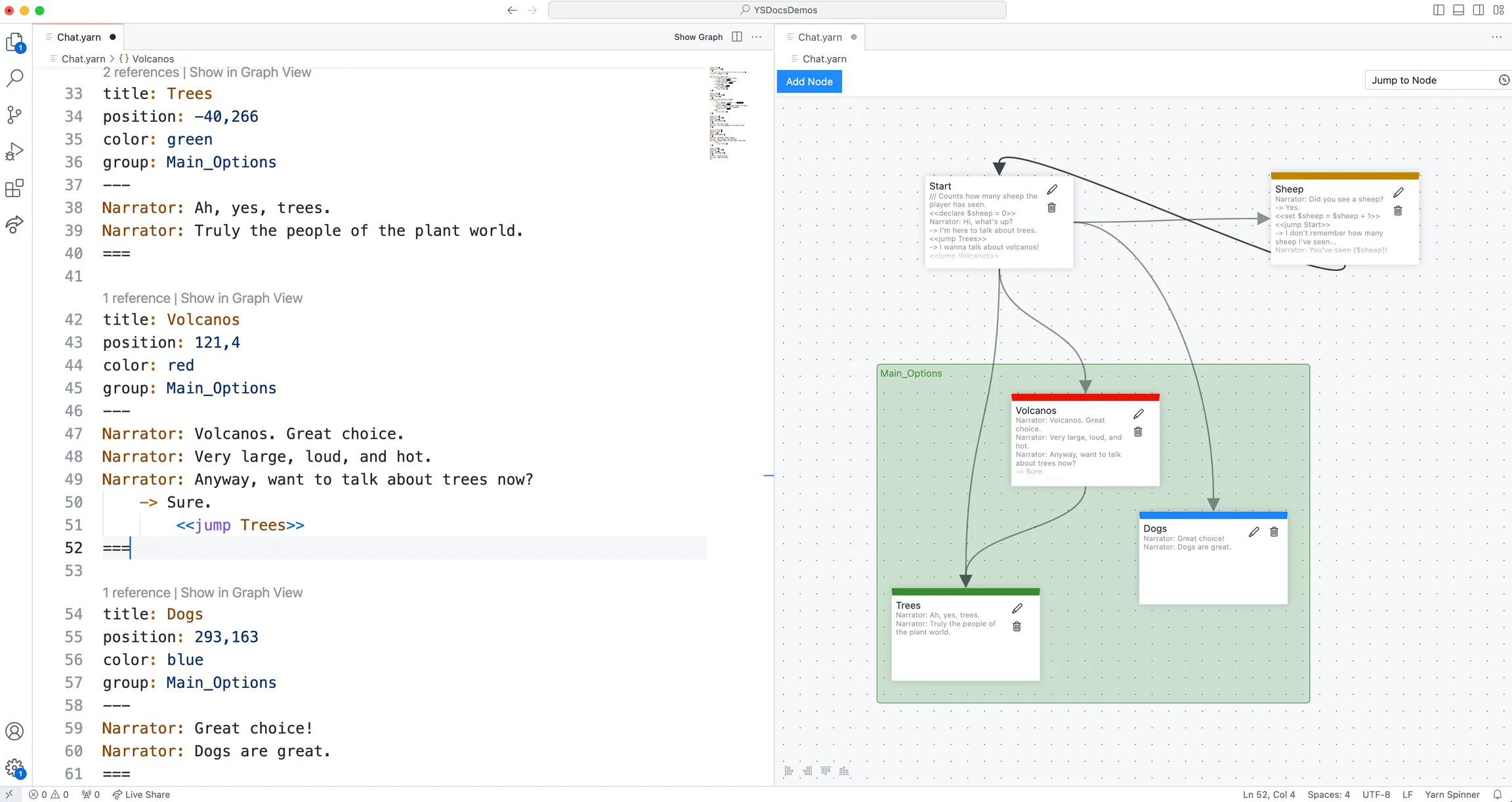Yarn Scripts are just text files that are saved with a .yarn extension. If you have another preferred editing environment, feel free to use that. Yarn Spinner for Visual Studio Code Extension provides many useful features, including a graph view, autocomplete, syntax highlighting, and beyond, but if you prefer writing your Yarn Scripts in something else, feel free to.