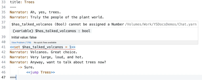 Yarn Spinner for Visual Studio Code also helps you keep track of any potential type issues, when you might accidentally try and use a variable without adhering to its type. So, if you <<declare>> a variable to be a certain type, for example a boolean: