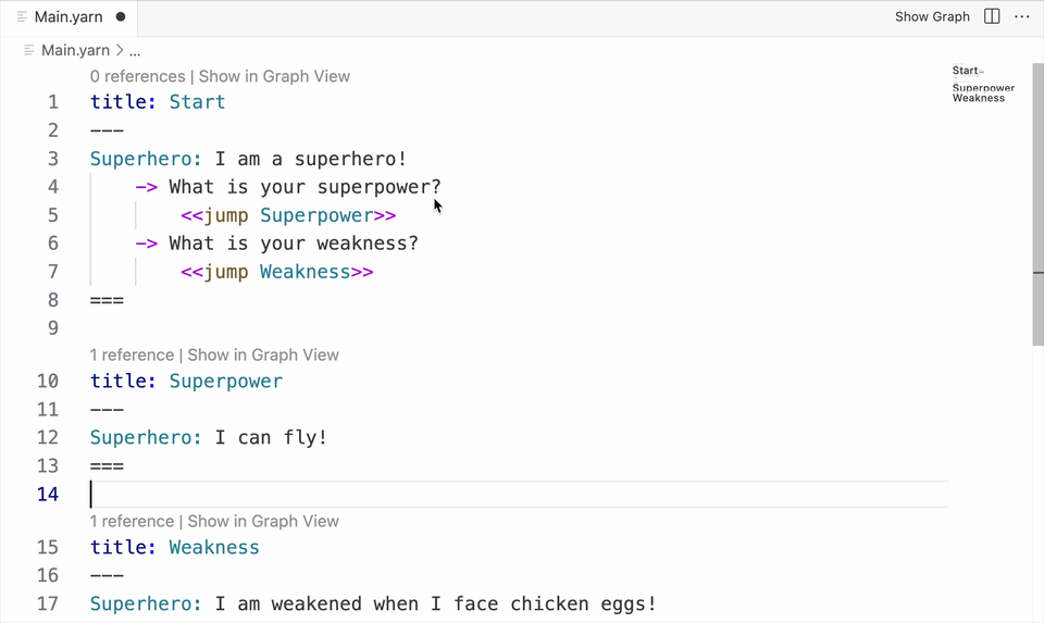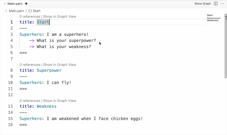Update your Main.yarn file in Visual Studio Code to resemble the following.