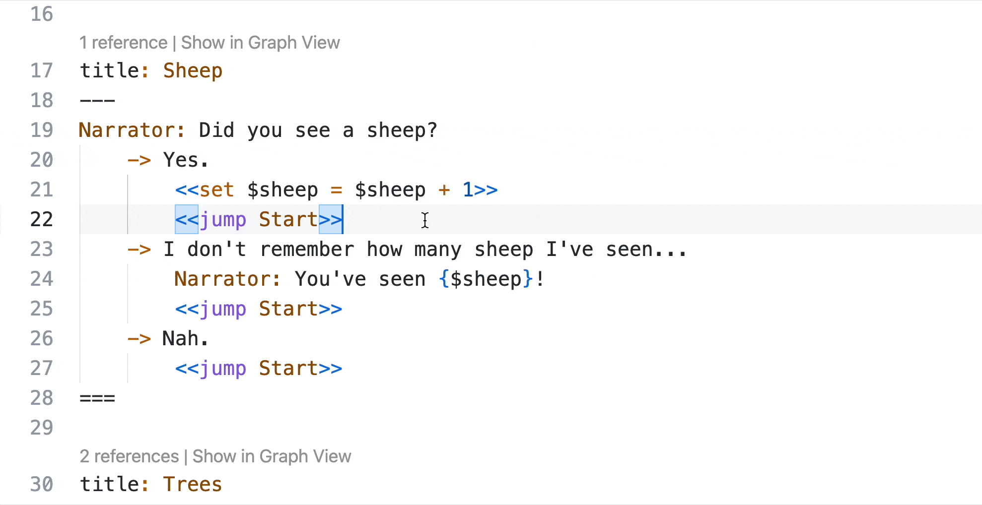 You can also command- (on macOS) or control-click (on Windows or Linux) on node names in commands to jump to the node in your Yarn Script.